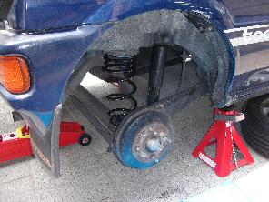 ジャッキでアームを持ち上げショックアブソーバーを外します(ショックアブソーバーのはずし方はこちらで)。 ショックアブソーバーをはずせばサスペンションは手ではずせます。 |